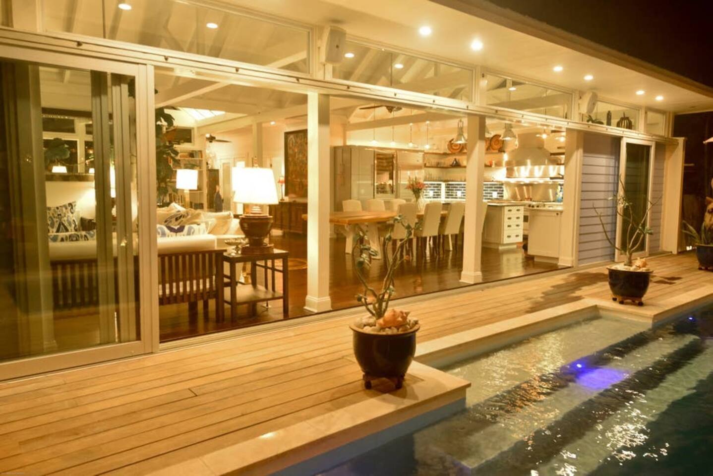 This Grand, four-bedroom, three-bathroom house offers two master suites, an incredible kitchen, and a heated saltwater pool! The great room hosts a state-of-the-art gourmet kitchen with its breathtaking 30' vaulted post and beam ceiling. It is a playground for the passionate chef and ideal for entertaining family and friends. Slide open the 20-foot glass wall and enter the heated saltwater pool with jacuzzi jets. Lounge around the pool deck with a cool drink or play bocce on the back lawn.