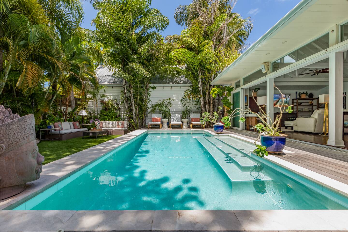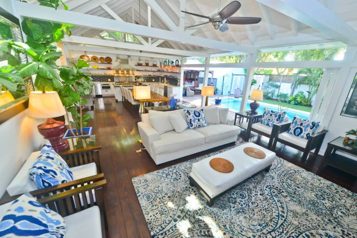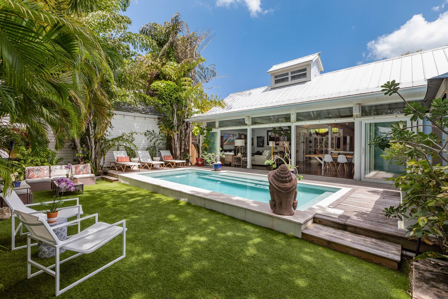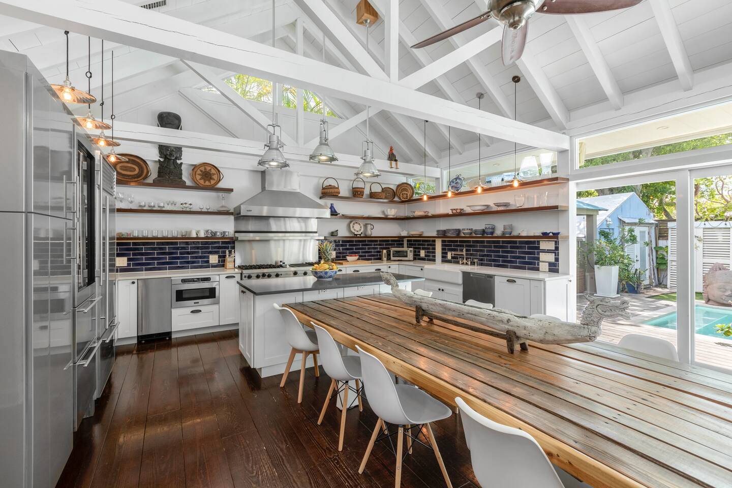 Blu on White is a culinary playground for passionate chefs and an ideal space for hosting family and friends. Relax on the pool deck with a refreshing drink or play bocce on the lush back lawn. This recently renovated traditional shotgun house with a twist encompasses four bedrooms and three bathrooms, including two master suites. The spacious post-and-beam addition leads to an outdoor area with a heated saltwater pool. Bask in the unique ambiance of the outdoor seating area or set off on our complimentary bikes to explore the world-class restaurants of Key West. Our prime location puts the beach just three blocks away and Cuban coffee shops mere steps from your doorstep, with Con Leche, Buccis, and Cheese bread waiting to be savored. Spread across a spacious 2,500 square feet, Blu on White ensures ample room for your entire family to enjoy their vacation.