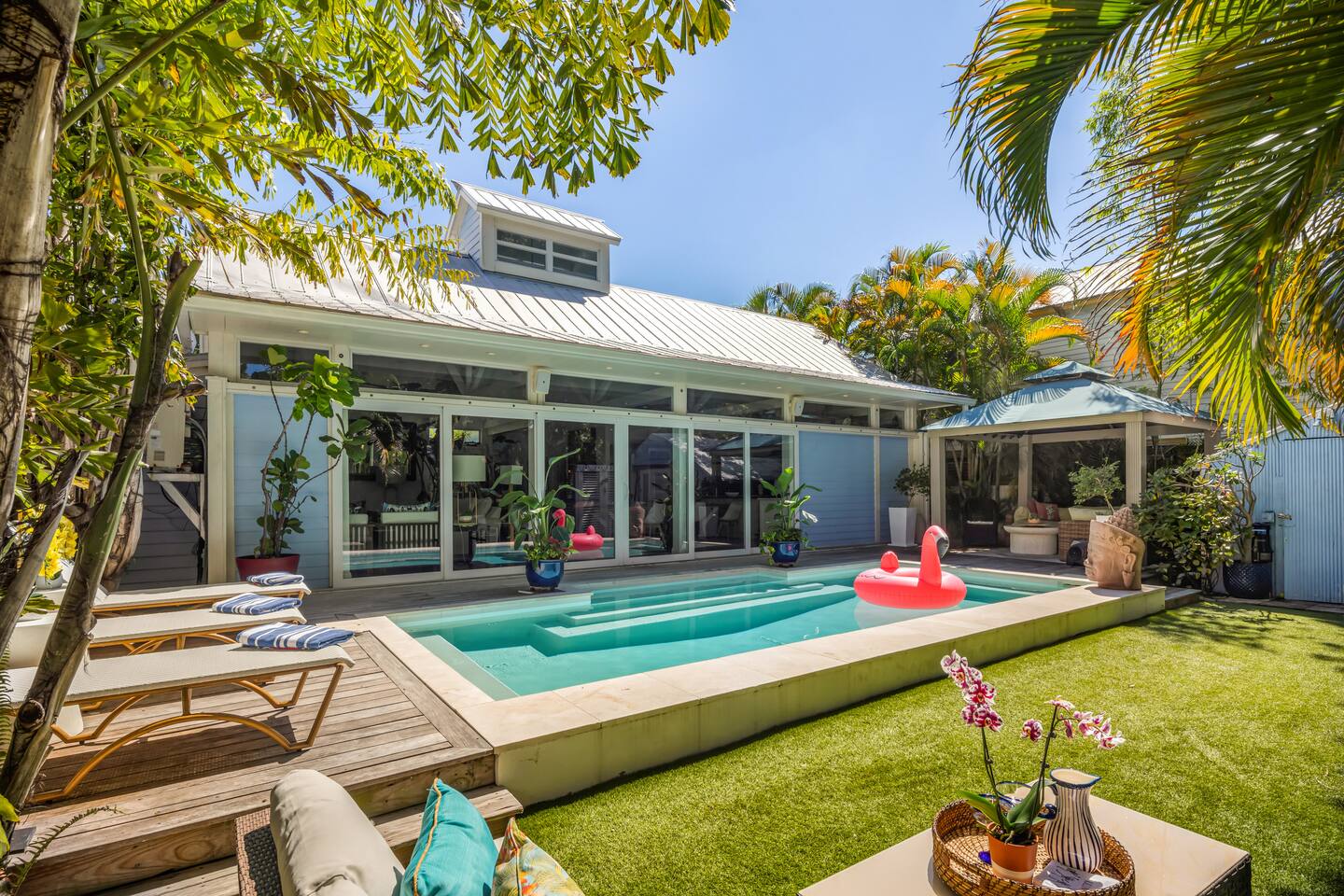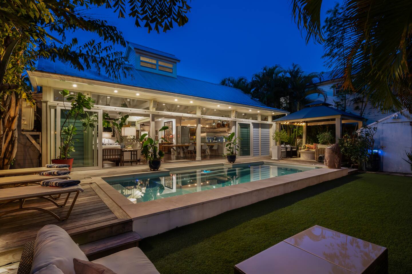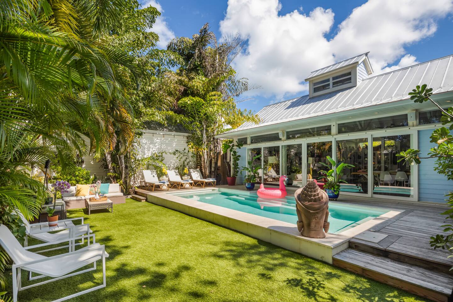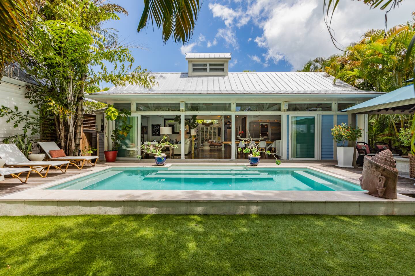 Blu on White is a culinary playground for passionate chefs and an ideal space for hosting family and friends. Relax on the pool deck with a refreshing drink or play bocce on the lush back lawn. This recently renovated traditional shotgun house with a twist encompasses four bedrooms and three bathrooms, including two master suites. The spacious post-and-beam addition leads to an outdoor area with a heated saltwater pool. Bask in the unique ambiance of the outdoor seating area or set off on our complimentary bikes to explore the world-class restaurants of Key West. Our prime location puts the beach just three blocks away and Cuban coffee shops mere steps from your doorstep, with Con Leche, Buccis, and Cheese bread waiting to be savored. Spread across a spacious 2,500 square feet, Blu on White ensures ample room for your entire family to enjoy their vacation.