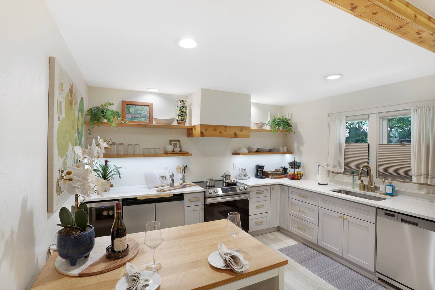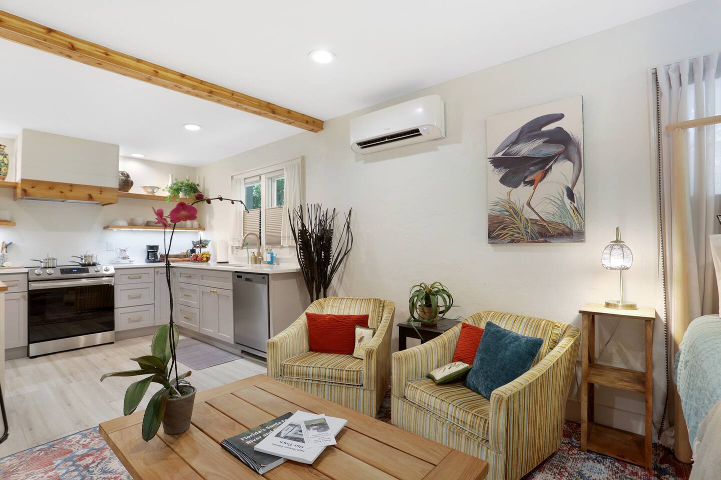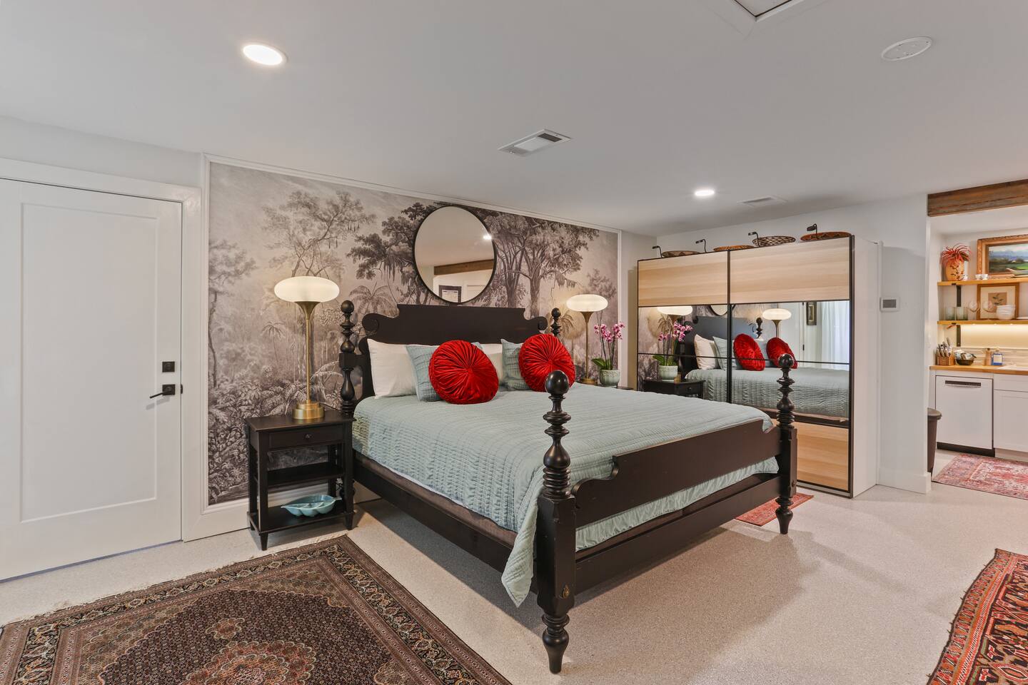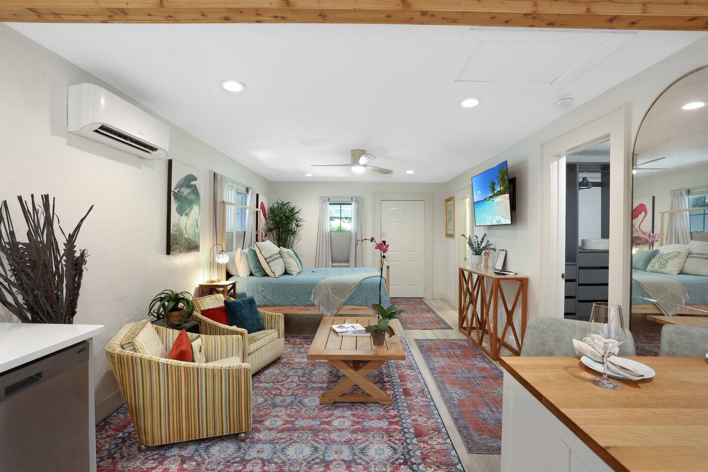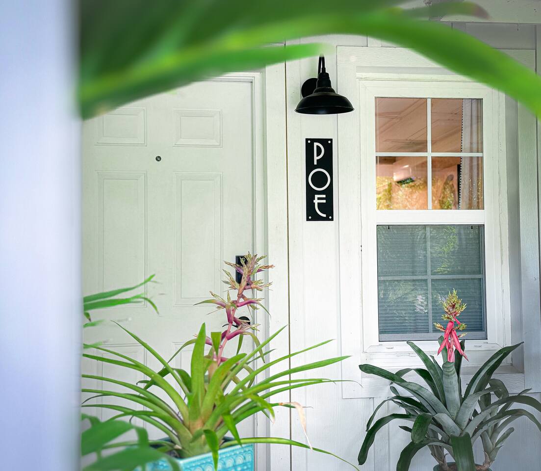 The Spring Suites comprises two studio apartments, "The Lilly" and"The Poe." Each private studio is approximately 500 square feet and includes a full kitchen, a full bathroom, and a covered porch with private outdoor seating. "The Lilly" boasts a king-size bed, a large armoire closet, and a fridge with an ice maker. "The Poe" has a queen-size bed, a large walk-in closet, an under-counter fridge with a freezer, and a bev fridge. They both have comfortable seating, a dedicated workspace, and high-speed, fiber-optic wifi with state-of-the-art 55" OLED TVs.